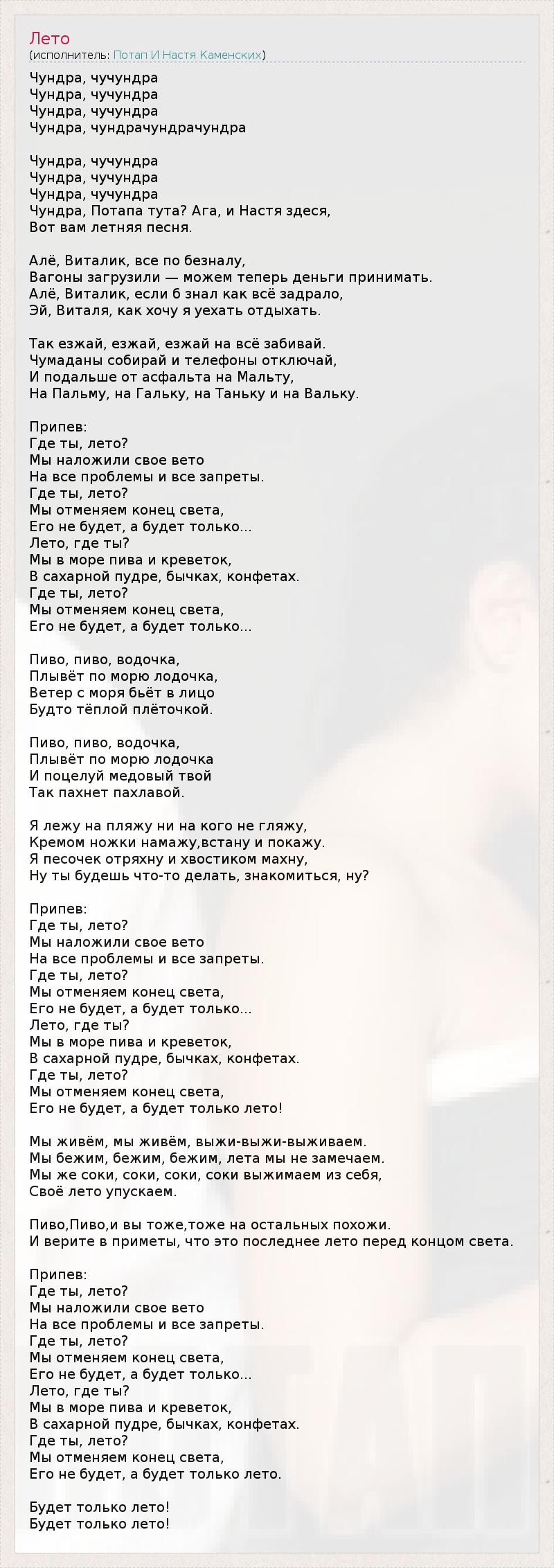 Это интересно:Потап и Настя – молодая развивающаяся группа, образовавшаяся не так давно, музыкальным жанром которой является стиль R&B. Сама Настя появилась на экранах еще в 2005 году.Впервые о дуэте Потапа и Настя заговорили после исполнения ими песни "Без любви". Данный проект был разработан продюсерским центром "Music Motors" и так как носил... продолжение