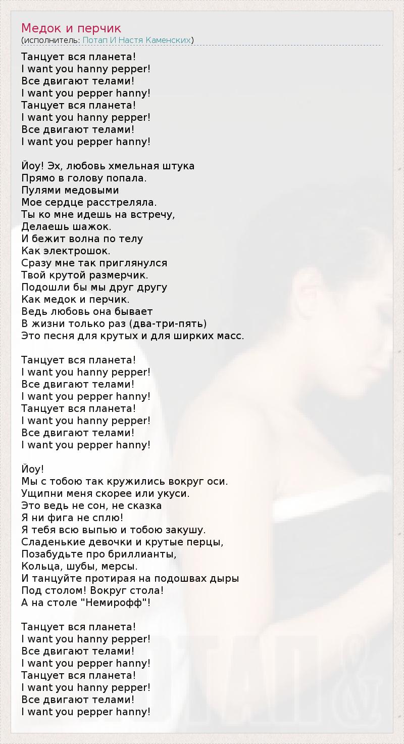 Танцует вся планета! I want you hanny pepper! Все двигают телами! I want you pepper hanny! Танцует вся планета! I want you hanny pepper! Все двигают телами! I want you pepper hanny! Йоу! Эх, любовь хмельная штука Прямо в голову попала. Пулями медовыми Мое сердце расстреляла. Ты ко мне идешь на встречу, Делаешь шажок. И бежит волна по телу Как электрошок. Сразу мне так приглянулся Твой крутой размерчик. Подошли бы мы друг другу Как медок и перчик. Ведь любовь она бывает В жизни только раз (два-три-пять) Это песня для крутых и для ширких масс. Танцует вся планета! I want you hanny pepper! Все двигают телами! I want you pepper hanny! Танцует вся планета! I want you hanny pepper! Все двигают телами! I want you pepper hanny! Йоу! Мы с тобою так кружились вокруг оси. Ущипни меня скорее или укуси. Это ведь не сон, не сказка Я ни фига не сплю! Я тебя всю выпью и тобою закушу. Сладенькие девочки и крутые перцы, Позабудьте про бриллианты, Кольца, шубы, мерсы. И танцуйте протирая на подошвах дыры Под столом! Вокруг стола! А на столе "Немирофф"! Танцует вся планета! I want you hanny pepper! Все двигают телами! I want you pepper hanny! Танцует вся планета! I want you hanny pepper! Все двигают телами! I want you pepper hanny!