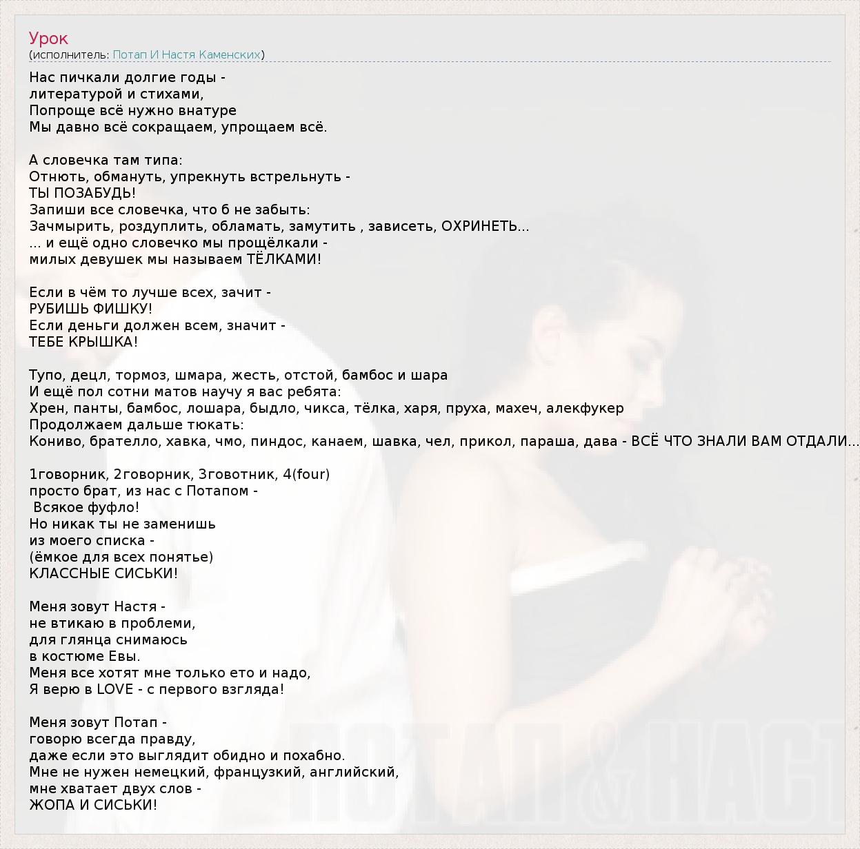 Нас пичкали долгие годы - литературой и стихами, Попроще всё нужно внатуре Мы давно всё сокращаем, упрощаем всё. А словечка там типа: Отнють, обмануть, упрекнуть встрельнуть - ТЫ ПОЗАБУДЬ! Запиши все словечка, что б не забыть: Зачмырить, роздуплить, обламать, замутить , зависеть, ОХРИНЕТЬ... ... и ещё одно словечко мы прощёлкали - милых девушек мы называем ТЁЛКАМИ! Если в чём то лучше всех, зачит - РУБИШЬ ФИШКУ! Если деньги должен всем, значит - ТЕБЕ КРЫШКА! Тупо, децл, тормоз, шмара, жесть, отстой, бамбос и шара И ещё пол сотни матов научу я вас ребята: Хрен, панты, бамбос, лошара, быдло, чикса, тёлка, харя, пруха, махеч, алекфукер Продолжаем дальше тюкать: Кониво, брателло, хавка, чмо, пиндос, канаем, шавка, чел, прикол, параша, дава - ВСЁ ЧТО ЗНАЛИ ВАМ ОТДАЛИ... 1говорник, 2говорник, 3говотник, 4(four) просто брат, из нас с Потапом - Всякое фуфло! Но никак ты не заменишь из моего списка - (ёмкое для всех понятье) КЛАССНЫЕ СИСЬКИ! Меня зовут Настя - не втикаю в проблеми, для глянца снимаюсь в костюме Евы. Меня все хотят мне только ето и надо, Я верю в LOVE - с первого взгляда! Меня зовут Потап - говорю всегда правду, даже если это выглядит обидно и похабно. Мне не нужен немецкий, французкий, английский, мне хватает двух слов - ЖОПА И СИСЬКИ!