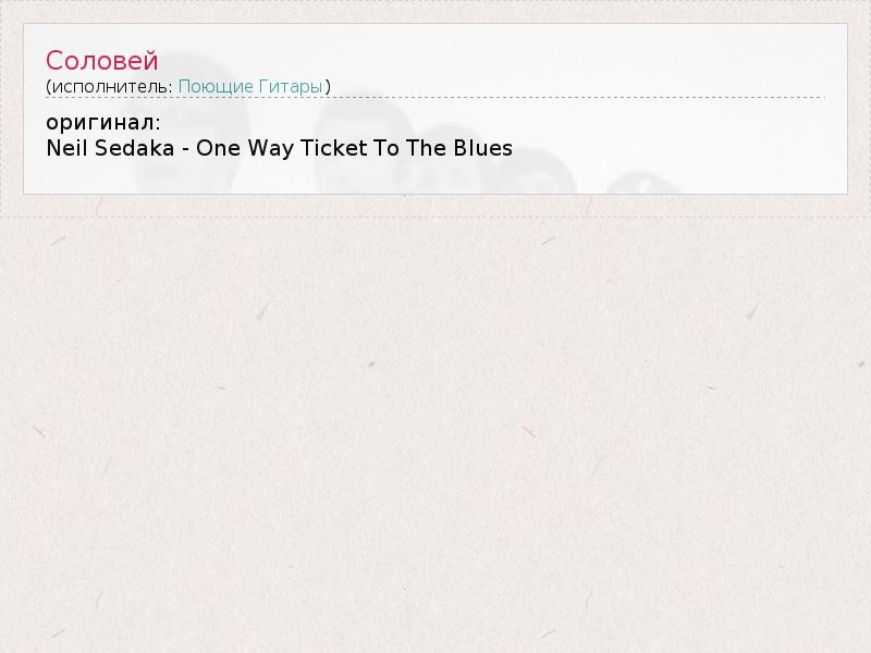 Это интересно:Летом 1966 года гитарист Ленинградского ансамбля «Дружба» Анатолий Васильев собрал несколько родственных ему по духу и восприятию музыки Ленинградских музыкантов и уехал с ними на берег Чёрного моря, на турбазу. Там, за стол и дом, они по вечерам играли на танцах для отдыхающих туристов, а целые дни репетировали непривычную по тем временам в нашей стране музыку. Учились одновременно петь... продолжение