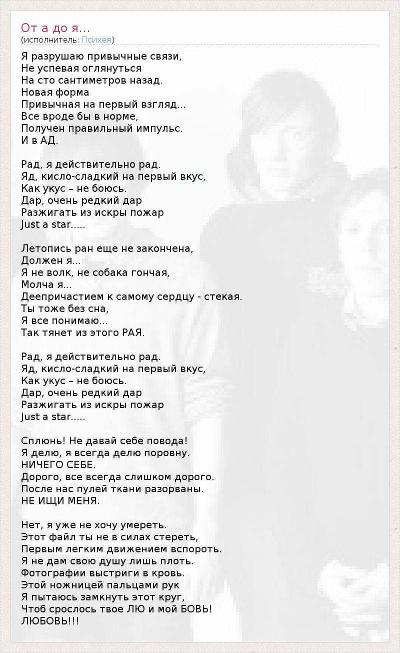 Я разрушаю привычные связи, Не успевая оглянуться На сто сантиметров назад. Новая форма Привычная на первый взгляд... Все вроде бы в норме, Получен правильный импульс. И в АД. Рад, я действительно рад. Яд, кисло-сладкий на первый вкус, Как укус – не боюсь. Дар, очень редкий дар Разжигать из искры пожар Just a star..... Летопись ран еще не закончена, Должен я... Я не волк, не собака гончая, Молча я... Деепричастием к самому сердцу - стекая. Ты тоже без сна, Я все понимаю... Так тянет из этого РАЯ. Рад, я действительно рад. Яд, кисло-сладкий на первый вкус, Как укус – не боюсь. Дар, очень редкий дар Разжигать из искры пожар Just a star..... Сплюнь! Не давай себе повода! Я делю, я всегда делю поровну. НИЧЕГО СЕБЕ. Дорого, все всегда слишком дорого. После нас пулей ткани разорваны. НЕ ИЩИ МЕНЯ. Нет, я уже не хочу умереть. Этот файл ты не в силах стереть, Первым легким движением вспороть. Я не дам свою душу лишь плоть. Фотографии выстриги в кровь. Этой ножницей пальцами рук Я пытаюсь замкнуть этот круг, Чтоб срослось твое ЛЮ и мой БОВЬ! ЛЮБОВЬ!!!