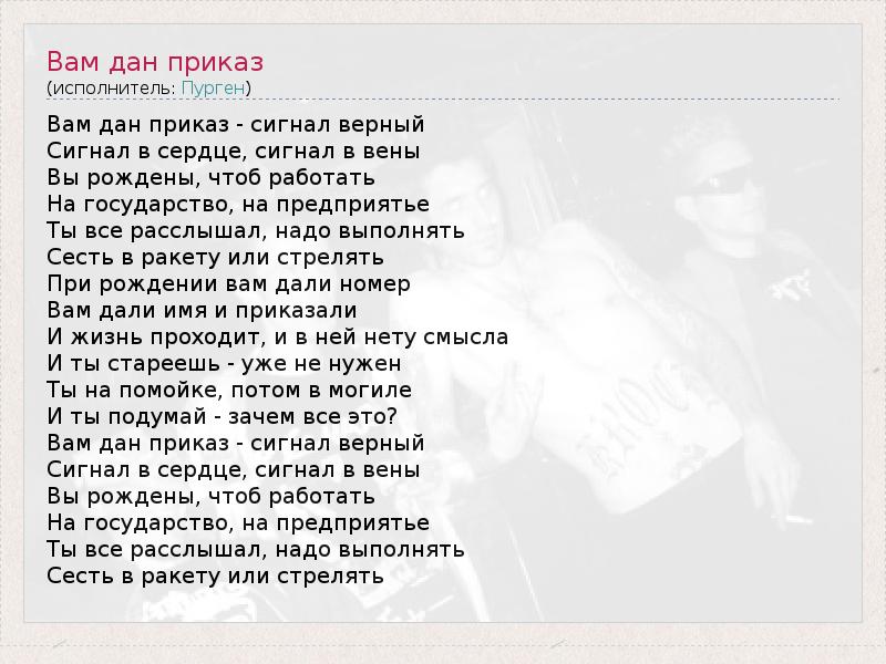 ГлавнаяИсполнителиПургенВам дан приказ