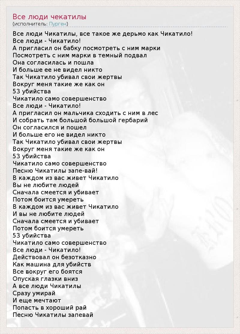 Все люди Чикатилы, все такое же дерьмо как Чикатило! Все люди - Чикатило! А пригласил он бабку посмотреть с ним марки Посмотреть с ним марки в темный подвал Она согласилась и пошла И больше ее не видел никто Так Чикатило убивал свои жертвы Вокруг меня такие же как он 53 убийства Чикатило само совершенство Все люди - Чикатило! А пригласил он мальчика сходить с ним в лес И собрать там большой большой гербарий Он согласился и пошел И больше его не видел никто Так Чикатило убивал свои жертвы Вокруг меня такие же как он 53 убийства Чикатило само совершенство Песню Чикатилы запе-вай! В каждом из вас живет Чикатило Вы не любите людей Сначала смеется и убивает Потом боится умереть В каждом из вас живет Чикатило И вы не любите людей Сначала смеется и убивает Потом боится умереть 53 убийства Чикатило само совершенство Все люди - Чикатило! Действовал он безотказно Как машина для убийств Все вокруг его боятся Опуская глазки вниз А все люди Чикатилы Сразу умирай И еще мечтают Попасть в хороший рай Песню Чикатилы запевай