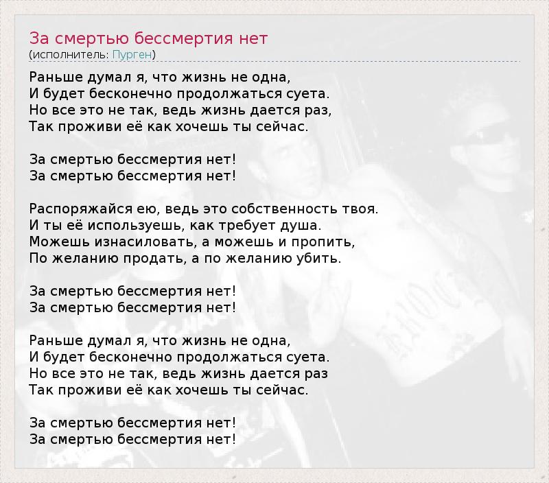 ГлавнаяИсполнителиПургенЗа смертью бессмертия нет