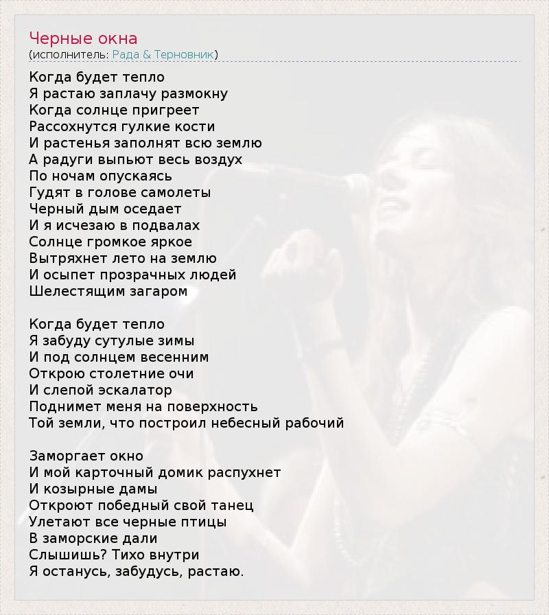 Когда будет тепло Я растаю заплачу размокну Когда солнце пригреет Рассохнутся гулкие кости И растенья заполнят всю землю А радуги выпьют весь воздух По ночам опускаясь Гудят в голове самолеты Черный дым оседает И я исчезаю в подвалах Солнце громкое яркое Вытряхнет лето на землю И осыпет прозрачных людей Шелестящим загаром Когда будет тепло Я забуду сутулые зимы И под солнцем весенним Открою столетние очи И слепой эскалатор Поднимет меня на поверхность Той земли, что построил небесный рабочий Заморгает окно И мой карточный домик распухнет И козырные дамы Откроют победный свой танец Улетают все черные птицы В заморские дали Слышишь? Тихо внутри Я останусь, забудусь, растаю.