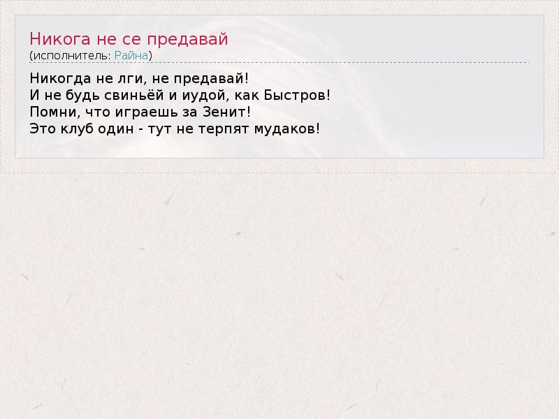 Никогда не лги, не предавай! И не будь свиньёй и иудой, как Быстров! Помни, что играешь за Зенит! Это клуб один - тут не терпят мудаков!