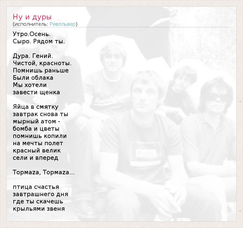 Это интересно:Группа Револьвер основана в столице Карелии, Петрозаводске, в 1988 году. В 1994 – первым из музыкальных коллективов Северо-Западного региона начинает регулярно выступать в клубах Питера и затем Москвы. 1995-99 - записаны и выпущены два магнитоальбома - «БИТЛЗ» (Castle Rock Records, 1995) и «РЕВОЛЬВЕР» ( DDT Records, 1997).Выступления на первых двух «Питерских рок-фестивалях», фестивале «Контр-попс» и т. д.Револьвер... продолжение