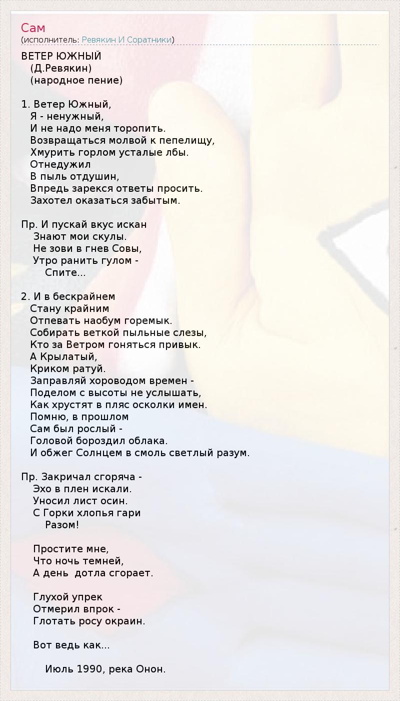 Это интересно:Дмитрий Ревякин, лидер новосибирской группы "Калинов мост", совместно со своими соратниками записал сольный альбом "Обряд"Альбом записан и сведён в студии "На Полянке", весна-осень 1997г.Дмитрий Ревякин - пение, акустическая гитара;Владимир Коновалов - бас;Василий Смоленцев - гитары, подпевки;Михаил Соколов - барабаны, перкуссия, хомус, пэн, подпевки;Хо... продолжение