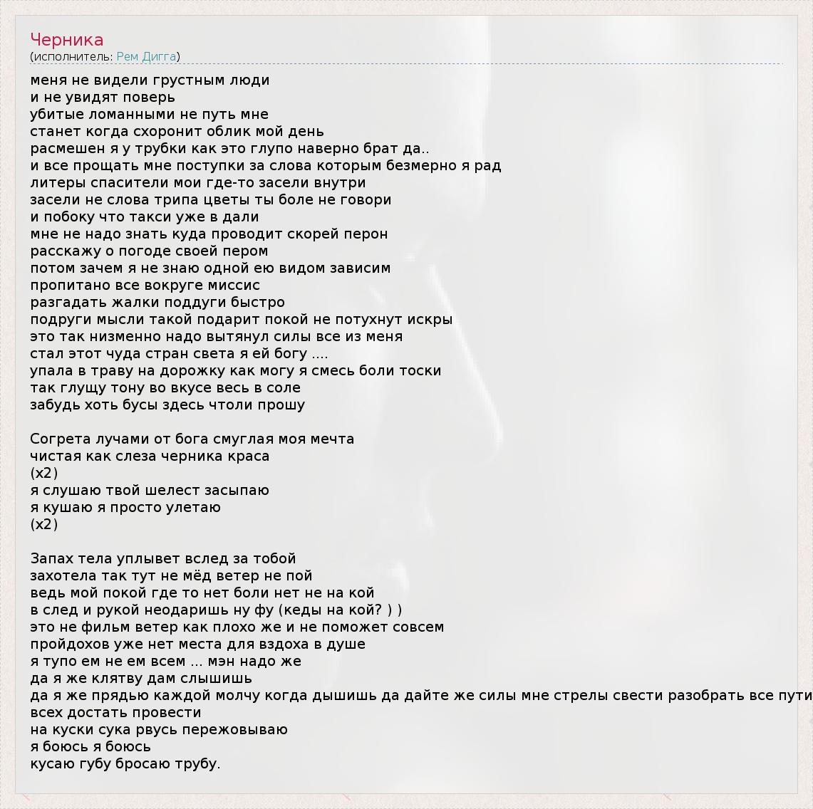меня не видели грустным люди и не увидят поверь убитые ломанными не путь мне станет когда схоронит облик мой день расмешен я у трубки как это глупо наверно брат да.. и все прощать мне поступки за слова которым безмерно я рад литеры спасители мои где-то засели внутри засели не слова трипа цветы ты боле не говори и побоку что такси уже в дали мне не надо знать куда проводит скорей перон расскажу о погоде своей пером потом зачем я не знаю одной ею видом зависим пропитано все вокруге миссис разгадать жалки поддуги быстро подруги мысли такой подарит покой не потухнут искры это так низменно надо вытянул силы все из меня стал этот чуда стран света я ей богу .... упала в траву на дорожку как могу я смесь боли тоски так глущу тону во вкусе весь в соле забудь хоть бусы здесь чтоли прошу Согрета лучами от бога смуглая моя мечта чистая как слеза черника краса (х2) я слушаю твой шелест засыпаю я кушаю я просто улетаю (х2) Запах тела уплывет вслед за тобой захотела так тут не мёд ветер не пой ведь мой покой где то нет боли нет не на кой в след и рукой неодаришь ну фу (кеды на кой? ) ) это не фильм ветер как плохо же и не поможет совсем пройдохов уже нет места для вздоха в душе я тупо ем не ем всем ... мэн надо же да я же клятву дам слышишь да я же прядью каждой молчу когда дышишь да дайте же силы мне стрелы свести разобрать все пути всех достать провести на куски сука рвусь пережовываю я боюсь я боюсь кусаю губу бросаю трубу.
