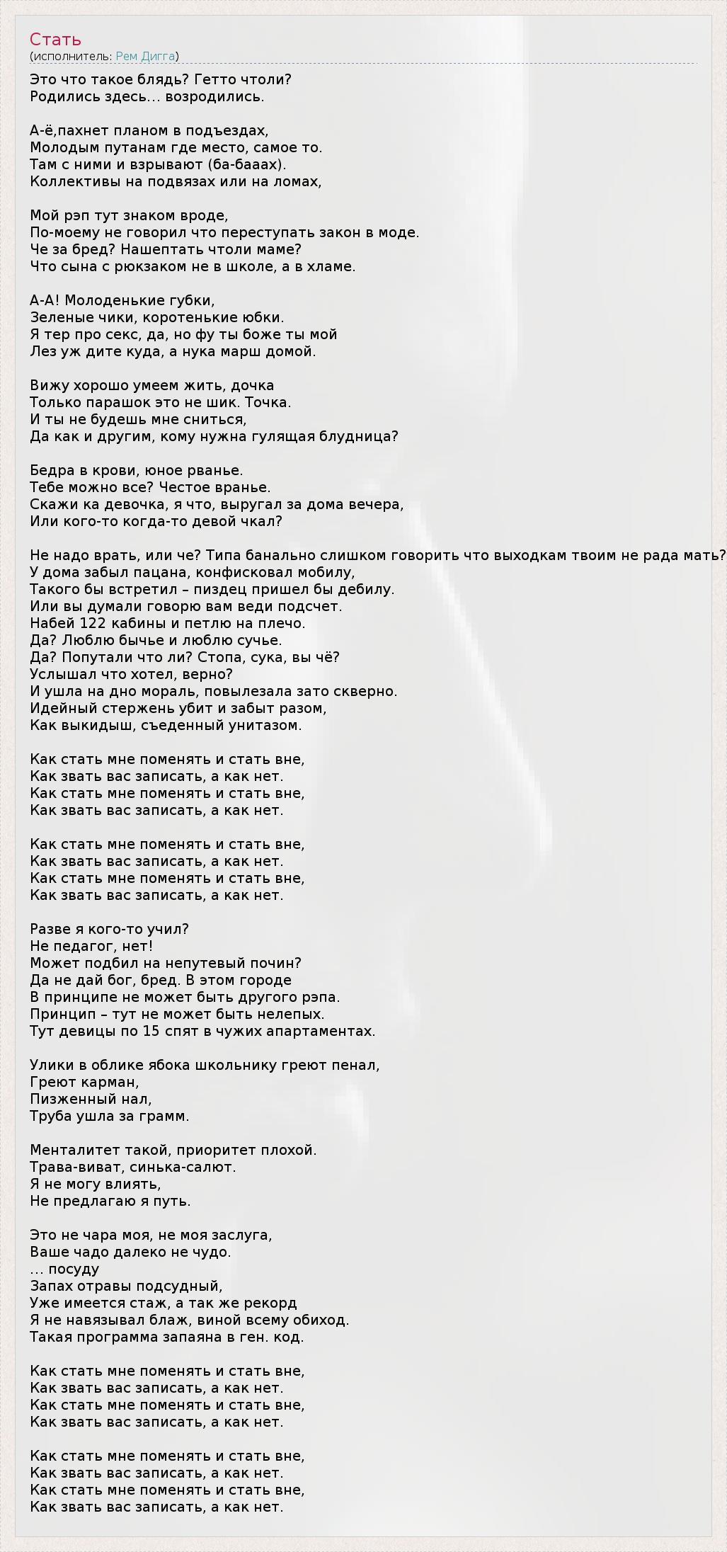 Это что такое блядь? Гетто чтоли? Родились здесь… возродились. А-ё,пахнет планом в подъездах, Молодым путанам где место, самое то. Там с ними и взрывают (ба-бааах). Коллективы на подвязах или на ломах, Мой рэп тут знаком вроде, По-моему не говорил что переступать закон в моде. Че за бред? Нашептать чтоли маме? Что сына с рюкзаком не в школе, а в хламе. А-А! Молоденькие губки, Зеленые чики, коротенькие юбки. Я тер про секс, да, но фу ты боже ты мой Лез уж дите куда, а нука марш домой. Вижу хорошо умеем жить, дочка Только парашок это не шик. Точка. И ты не будешь мне сниться, Да как и другим, кому нужна гулящая блудница? Бедра в крови, юное рванье. Тебе можно все? Честое вранье. Скажи ка девочка, я что, выругал за дома вечера, Или кого-то когда-то девой чкал? Не надо врать, или че? Типа банально слишком говорить что выходкам твоим не рада мать? У дома забыл пацана, конфисковал мобилу, Такого бы встретил – пиздец пришел бы дебилу. Или вы думали говорю вам веди подсчет. Набей 122 кабины и петлю на плечо. Да? Люблю бычье и люблю сучье. Да? Попутали что ли? Стопа, сука, вы чё? Услышал что хотел, верно? И ушла на дно мораль, повылезала зато скверно. Идейный стержень убит и забыт разом, Как выкидыш, съеденный унитазом. Как стать мне поменять и стать вне, Как звать вас записать, а как нет. Как стать мне поменять и стать вне, Как звать вас записать, а как нет. Как стать мне поменять и стать вне, Как звать вас записать, а как нет. Как стать мне поменять и стать вне, Как звать вас записать, а как нет. Разве я кого-то учил? Не педагог, нет! Может подбил на непутевый почин? Да не дай бог, бред. В этом городе В принципе не может быть другого рэпа. Принцип – тут не может быть нелепых. Тут девицы по 15 спят в чужих апартаментах. Улики в облике ябока школьнику греют пенал, Греют карман, Пизженный нал, Труба ушла за грамм. Менталитет такой, приоритет плохой. Трава-виват, синька-салют. Я не могу влиять, Не предлагаю я путь. Это не чара моя, не моя заслуга, Ваше чадо далеко не чудо. … посуду Запах отравы подсудный, Уже имеется стаж, а так же рекорд Я не навязывал блаж, виной всему обиход. Такая программа запаяна в ген. код. Как стать мне поменять и стать вне, Как звать вас записать, а как нет. Как стать мне поменять и стать вне, Как звать вас записать, а как нет. Как стать мне поменять и стать вне, Как звать вас записать, а как нет. Как стать мне поменять и стать вне, Как звать вас записать, а как нет.