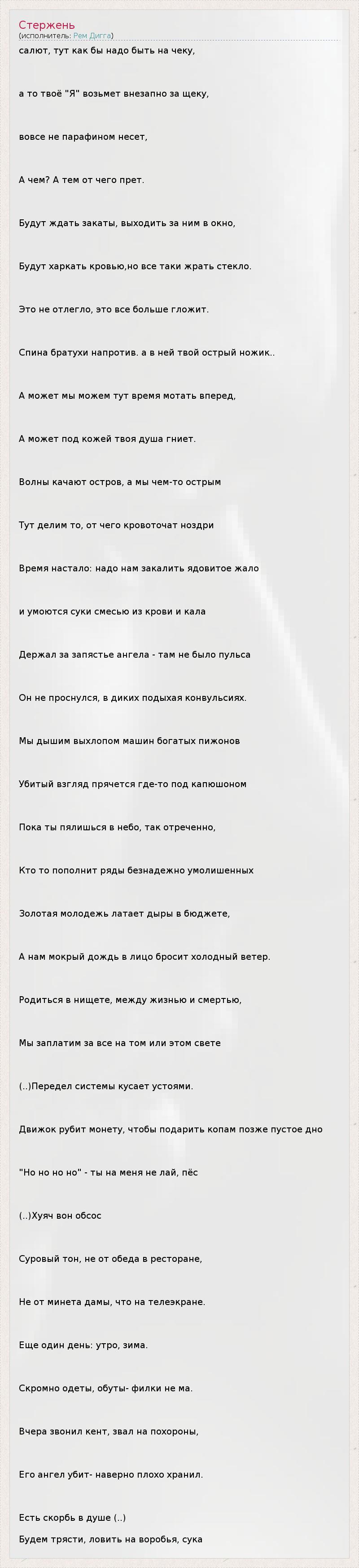 салют, тут как бы надо быть на чеку, а то твоё "Я" возьмет внезапно за щеку, вовсе не парафином несет, А чем? А тем от чего прет. Будут ждать закаты, выходить за ним в окно, Будут харкать кровью,но все таки жрать стекло. Это не отлегло, это все больше гложит. Спина братухи напротив. а в ней твой острый ножик.. А может мы можем тут время мотать вперед, А может под кожей твоя душа гниет. Волны качают остров, а мы чем-то острым Тут делим то, от чего кровоточат ноздри Время настало: надо нам закалить ядовитое жало и умоются суки смесью из крови и кала Держал за запястье ангела - там не было пульса Он не проснулся, в диких подыхая конвульсиях. Мы дышим выхлопом машин богатых пижонов Убитый взгляд прячется где-то под капюшоном Пока ты пялишься в небо, так отреченно, Кто то пополнит ряды безнадежно умолишенных Золотая молодежь латает дыры в бюджете, А нам мокрый дождь в лицо бросит холодный ветер. Родиться в нищете, между жизнью и смертью, Мы заплатим за все на том или этом свете (..)Передел системы кусает устоями. Движок рубит монету, чтобы подарить копам позже пустое дно "Но но но но" - ты на меня не лай, пёс (..)Хуяч вон обсос Суровый тон, не от обеда в ресторане, Не от минета дамы, что на телеэкране. Еще один день: утро, зима. Скромно одеты, обуты- филки не ма. Вчера звонил кент, звал на похороны, Его ангел убит- наверно плохо хранил. Есть скорбь в душе (..) Будем трясти, ловить на воробья, сука
