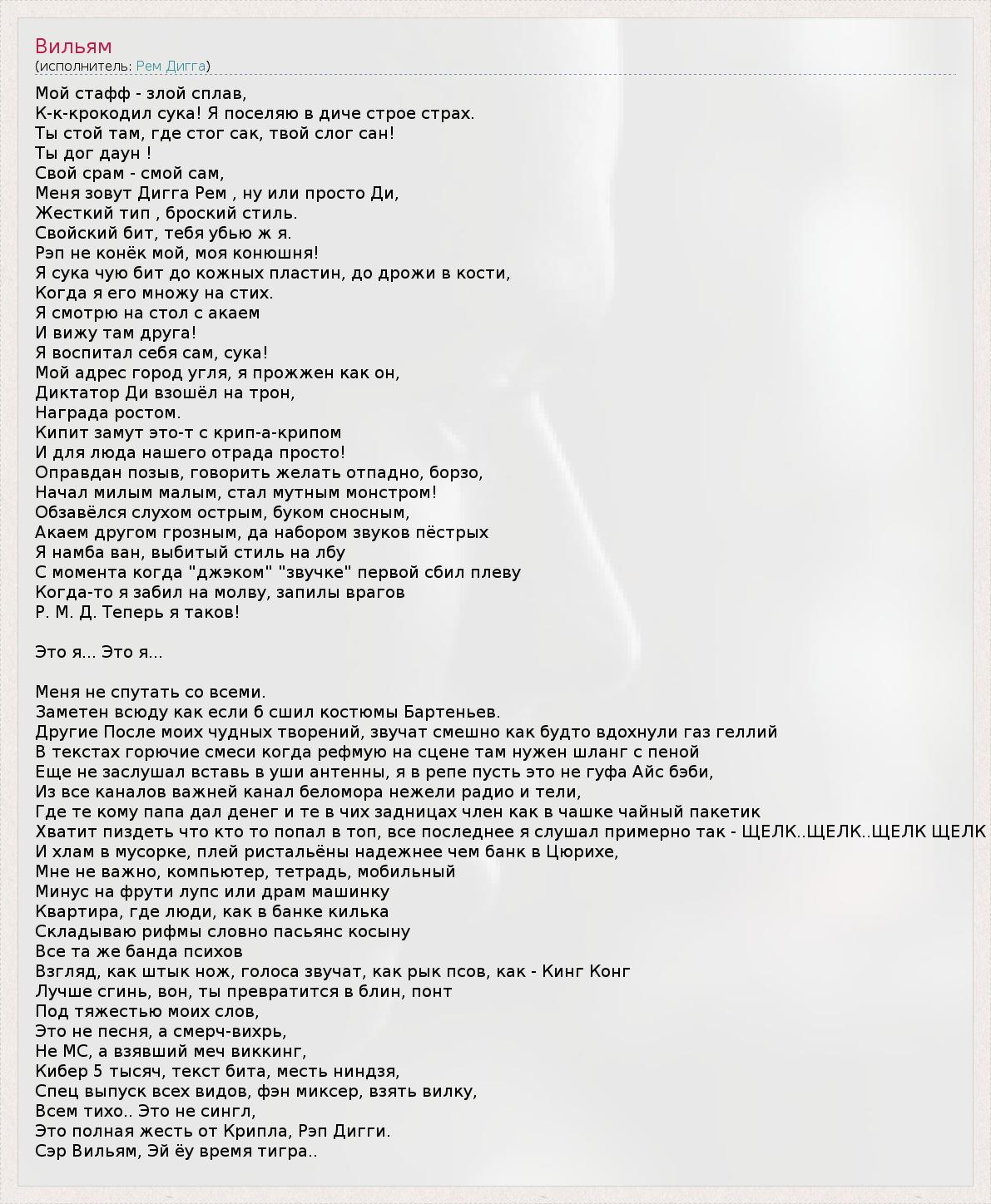 Это интересно:Рем Дигга – рэпер и битмейкер из города Гуково (Ростовская область) на юге России, участник группы Суиcайд.Рэпом Дигга, как и многие, увлекся еще в школьные годы, когда друг дал послушать альбом Onyx «Shut’em down». Впервые зачитал в одиннадцать лет на школьном утреннике с Шамой. С ним Рома также знаком еще со школьной... продолжение