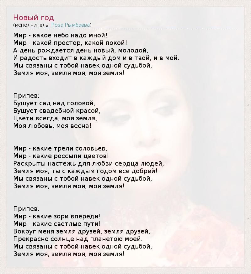 Мир - какое небо надо мной! Мир - какой простор, какой покой! А день рождается день новый, молодой, И радость входит в каждый дом и в твой, и в мой. Мы связаны с тобой навек одной судьбой, Земля моя, земля моя, моя земля! Припев: Бушует сад над головой, Бушует свадебной красой, Цвети всегда, моя земля, Моя любовь, моя весна! Мир - какие трели соловьев, Мир - какие россыпи цветов! Раскрыты настежь для любви сердца людей, Земля моя, ты с каждым годом все добрей! Мы связаны с тобой навек одной судьбой, Земля моя, земля моя, моя земля! Припев. Мир - какие зори впереди! Мир - какие светлые пути! Вокруг меня земля друзей, земля друзей, Прекрасно солнце над планетою моей. Мы связаны с тобой навек одной судьбой, Земля моя, земля моя, моя земля!