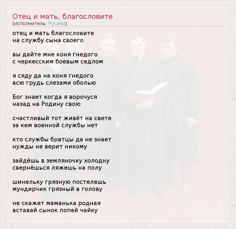 ГлавнаяИсполнителиРусичиОтец и мать, благословите