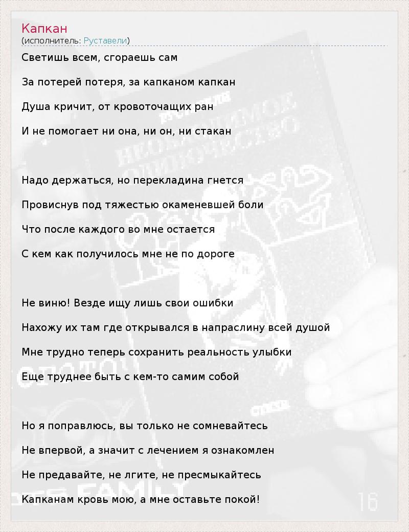 Светишь всем, сгораешь сам За потерей потеря, за капканом капкан Душа кричит, от кровоточащих ран И не помогает ни она, ни он, ни стакан Надо держаться, но перекладина гнется Провиснув под тяжестью окаменевшей боли Что после каждого во мне остается С кем как получилось мне не по дороге Не виню! Везде ищу лишь свои ошибки Нахожу их там где открывался в напраслину всей душой Мне трудно теперь сохранить реальность улыбки Еще труднее быть с кем-то самим собой Но я поправлюсь, вы только не сомневайтесь Не впервой, а значит с лечением я ознакомлен Не предавайте, не лгите, не пресмыкайтесь Капканам кровь мою, а мне оставьте покой!