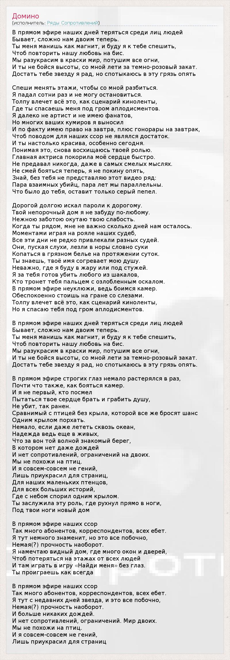 В прямом эфире наших дней теряться среди лиц людей Бывает, сложно нам двоим теперь. Ты меня манишь как магнит, и буду я к тебе спешить, Чтоб повторить нашу любовь на бис. Мы разукрасим в краски мир, потушим все огни, И ты не бойся высоты, со мной лети за темно-розовый закат. Достать тебе звезду я рад, но спотыкаюсь в эту грязь опять Спеши менять этажи, чтобы со мной разбиться. Я падал сотни раз и не могу остановиться. Толпу влечет всё это, как сценарий киноленты, Где ты спасаешь меня под гром аплодисментов. Я далеко не артист и не имею фанатов, Но многих ваших кумиров я выносил И по факту имею право на завтра, плюс гонорары на завтрак, Чтоб поводом для наших ссор не являлся достаток. И ты настолько красива, особенно сегодня. Понимая это, снова восхищаюсь твоей ролью. Главная актриса покорила моё сердце быстро. Не предавал никогда, даже в самых смелых мыслях. Не смей бояться теперь, я не покину опять, Знай, без тебя не представляю этот видео ряд: Пара взаимных убийц, пара лет мы параллельны. Что было до тебя, оставит только серый пепел. Дорогой долгою искал пароли к дорогому. Твой непорочный дом я не забуду по-любому. Нежною заботою окутаю твою слабость. Когда ты рядом, мне не важно сколько дней нам осталось. Моментами играя на рояле наших судеб, Все эти дни не редко привлекали разных судей. Они, пуская слухи, лезли в норы словно суки Копаться в грязном белье на протяжении суток. Ты знаешь, твоё имя согревает мою душу. Неважно, где я буду в жару или под стужей. Я за тебя готов убить любого из шакалов, Кто тронет тебя пальцем с озлобленным оскалом. В прямом эфире неуклюжи, ведь боимся камер. Обеспокоенно стоишь на гране со слезами. Толпу влечет всё это, как сценарий киноленты, Но я спасаю тебя под гром аплодисментов. В прямом эфире наших дней теряться среди лиц людей Бывает, сложно нам двоим теперь. Ты меня манишь как магнит, и буду я к тебе спешить, Чтоб повторить нашу любовь на бис. Мы разукрасим в краски мир, потушим все огни, И ты не бойся высоты, со мной лети за темно-розовый закат. Достать тебе звезду я рад, но спотыкаюсь в эту грязь опять. В прямом эфире строгих глаз немало растерялся в раз, Почти что также, как бояться камер. И я не первый, кто посмел Пытаться твое сердце брать и грабить душу, Не убит, так ранен. Сравнимый с птицей без крыла, которой все же бросят шанс Одним крылом порхать. Немало, если даже лететь сквозь океан, Надежда ведь еще в живых, Что за вон той волной знакомый берег, В котором нет даже дождей И нет сопротивлений, ограничений на двоих. Мы не похожи на птиц. И я совсем-совсем не гений, Лишь приукрасил для страниц, Для наших маленьких птенцов, Для всех больших историй, Где с небом спорил одним крылом. Ты заслужила эту роль, где рухнул прямо в ноги, Под твои ноги новый дом В прямом эфире наших ссор Так много абонентов, корреспондентов, всех ебет. Я тут немного знаменит, но это все побочно, Немая(?) прочность наоборот. Я намечтаю видный дом, где много окон и дверей, Чтоб потеряться на этажах от всех людей И там играть в игру «Найди меня» без глаз. Ты проиграешь как всегда В прямом эфире наших ссор Так много абонентов, корреспондентов, всех ебет. Я тут с недавних дней звезда, и это все побочно, Немая(?) прочность наоборот. И больше никаких дождей. И нет сопротивлений, ограничений. Мир двоих. Мы не похожи на птиц. И я совсем-совсем не гений, Лишь приукрасил для 