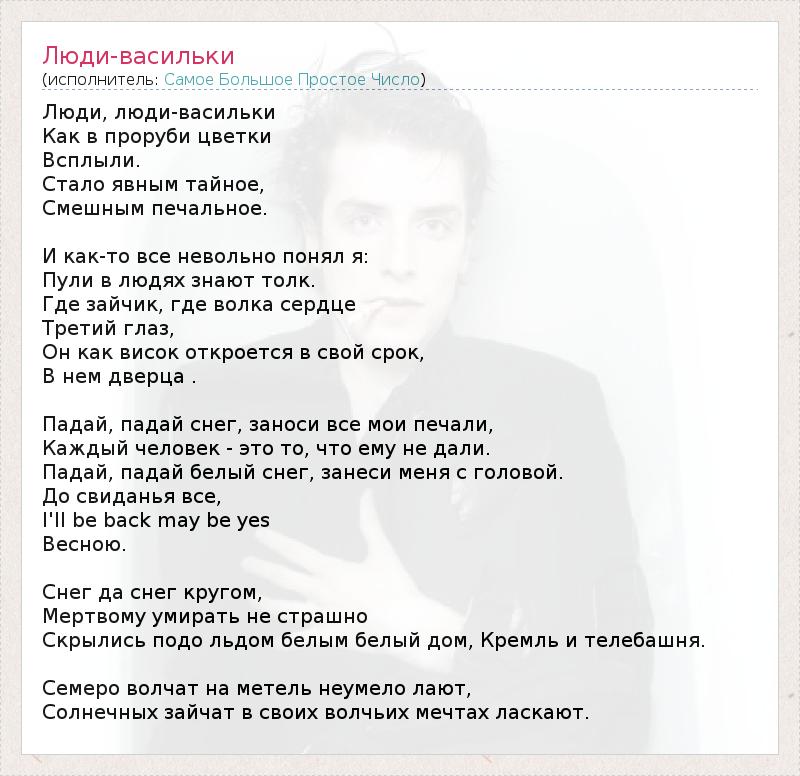 Люди, люди-васильки Как в проруби цветки Всплыли. Стало явным тайное, Смешным печальное. И как-то все невольно понял я: Пули в людях знают толк. Где зайчик, где волка сердце Третий глаз, Он как висок откроется в свой срок, В нем дверца . Падай, падай снег, заноси все мои печали, Каждый человек - это то, что ему не дали. Падай, падай белый снег, занеси меня с головой. До свиданья все, I'll be back may be yes Весною. Снег да снег кругом, Мертвому умирать не страшно Скрылись подо льдом белым белый дом, Кремль и телебашня. Семеро волчат на метель неумело лают, Солнечных зайчат в своих волчьих мечтах ласкают.