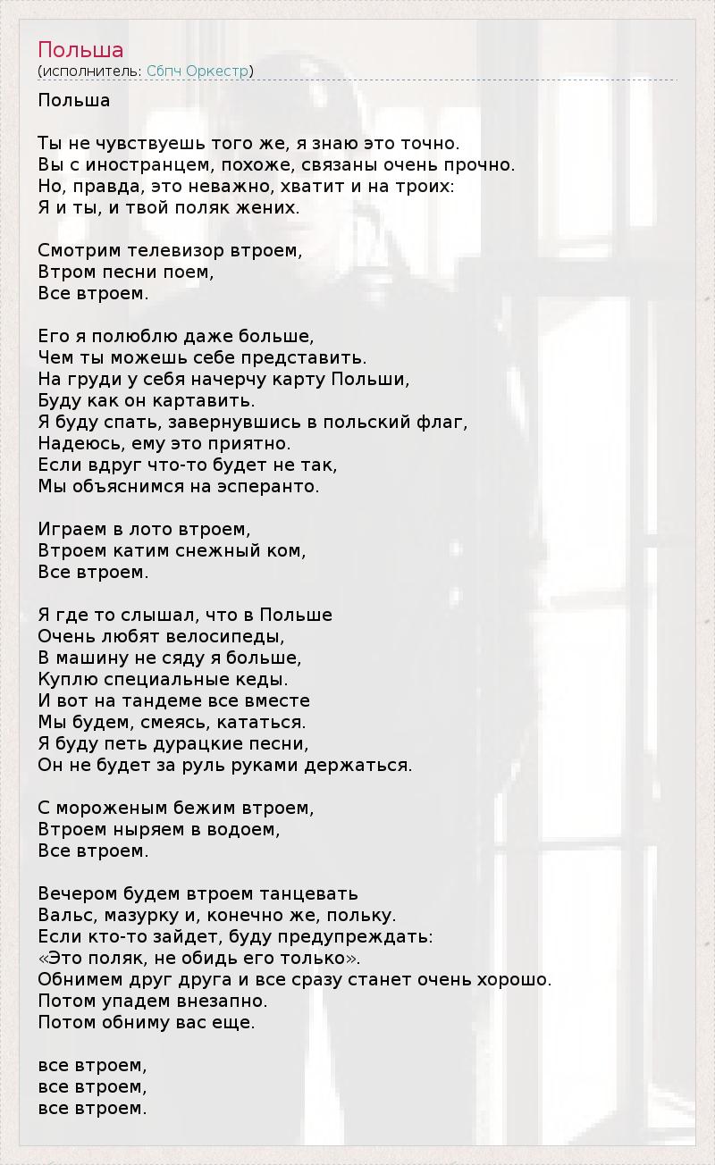 Польша Ты не чувствуешь того же, я знаю это точно. Вы с иностранцем, похоже, связаны очень прочно. Но, правда, это неважно, хватит и на троих: Я и ты, и твой поляк жених. Смотрим телевизор втроем, Втром песни поем, Все втроем. Его я полюблю даже больше, Чем ты можешь себе представить. На груди у себя начерчу карту Польши, Буду как он картавить. Я буду спать, завернувшись в польский флаг, Надеюсь, ему это приятно. Если вдруг что-то будет не так, Мы объяснимся на эсперанто. Играем в лото втроем, Втроем катим снежный ком, Все втроем. Я где то слышал, что в Польше Очень любят велосипеды, В машину не сяду я больше, Куплю специальные кеды. И вот на тандеме все вместе Мы будем, смеясь, кататься. Я буду петь дурацкие песни, Он не будет за руль руками держаться. С мороженым бежим втроем, Втроем ныряем в водоем, Все втроем. Вечером будем втроем танцевать Вальс, мазурку и, конечно же, польку. Если кто-то зайдет, буду предупреждать: «Это поляк, не обидь его только». Обнимем друг друга и все сразу станет очень хорошо. Потом упадем внезапно. Потом обниму вас еще. все втроем, все втроем, все втроем.