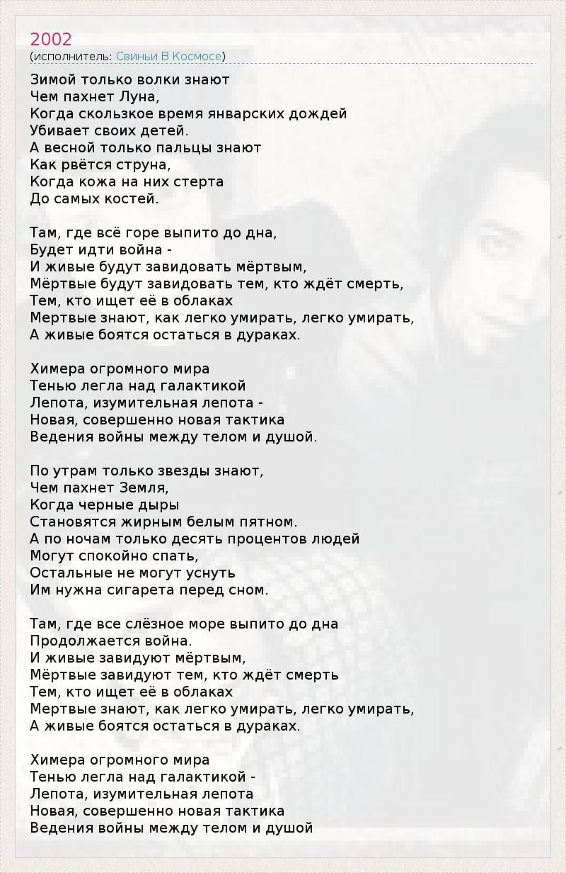 Это интересно:Группа Свиньи В Космосе была создана в конце 1998 года тремя одноклассниками из Выборга – Денисом, Веталей и Женей «Толстым». Научившись играть на каверах The Exploited и Sex Pistols, они начали писать свои песни - очень быстрые и простые.Толстого за полную профнепригодность прогнали с микрофона, и вокалистом стал ещё один одноклассник - Тёма.... продолжение