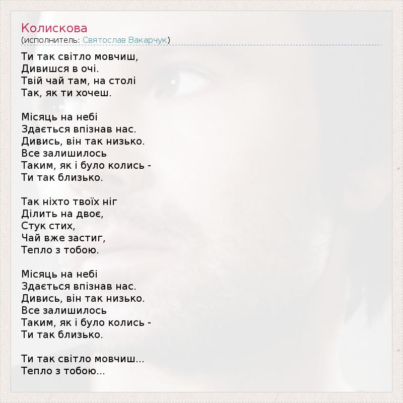 Ти так світло мовчиш, Дивишся в очі. Твій чай там, на столі Так, як ти хочеш. Місяць на небі Здається впізнав нас. Дивись, він так низько. Все залишилось Таким, як і було колись - Ти так близько. Так ніхто твоїх ніг Ділить на двоє, Стук стих, Чай вже застиг, Тепло з тобою. Місяць на небі Здається впізнав нас. Дивись, він так низько. Все залишилось Таким, як і було колись - Ти так близько. Ти так світло мовчиш... Тепло з тобою...