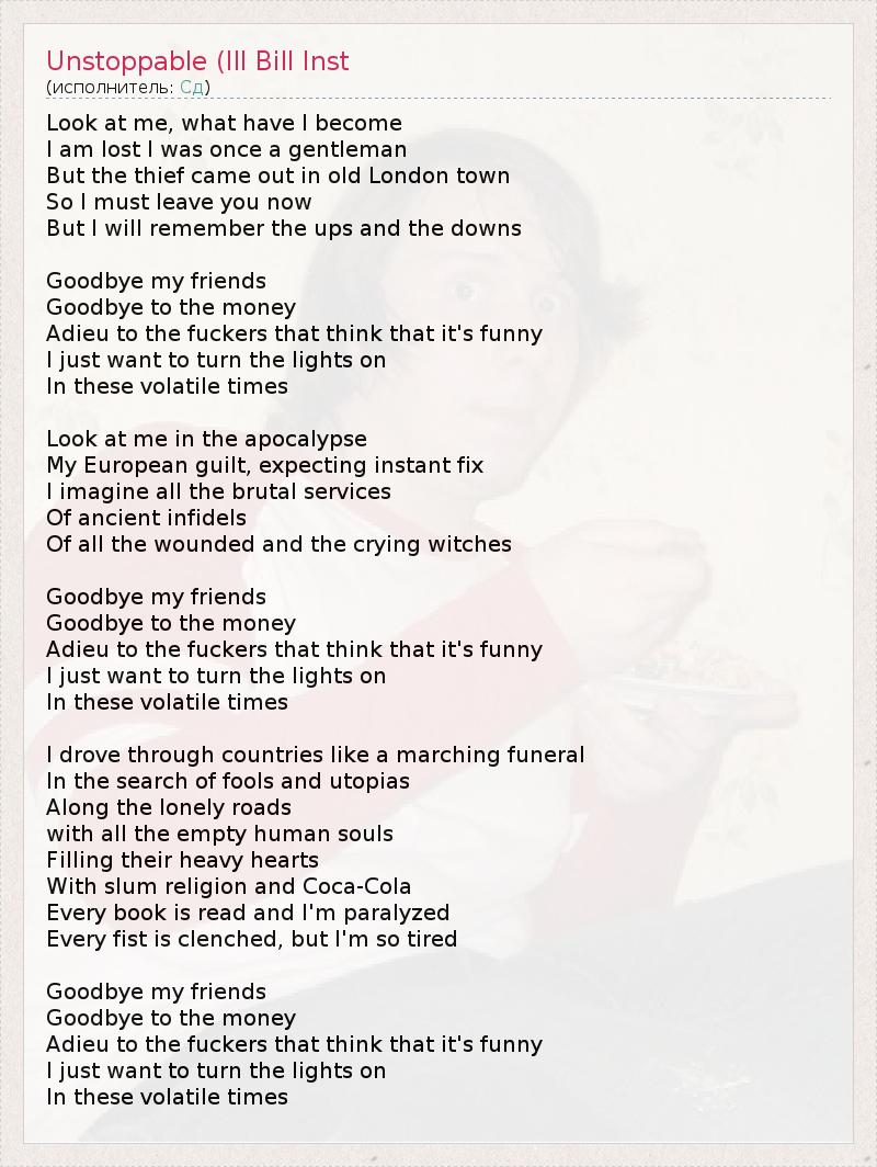 А как ты думаешь, о чем песня "Unstoppable (Ill Bill Inst" ?