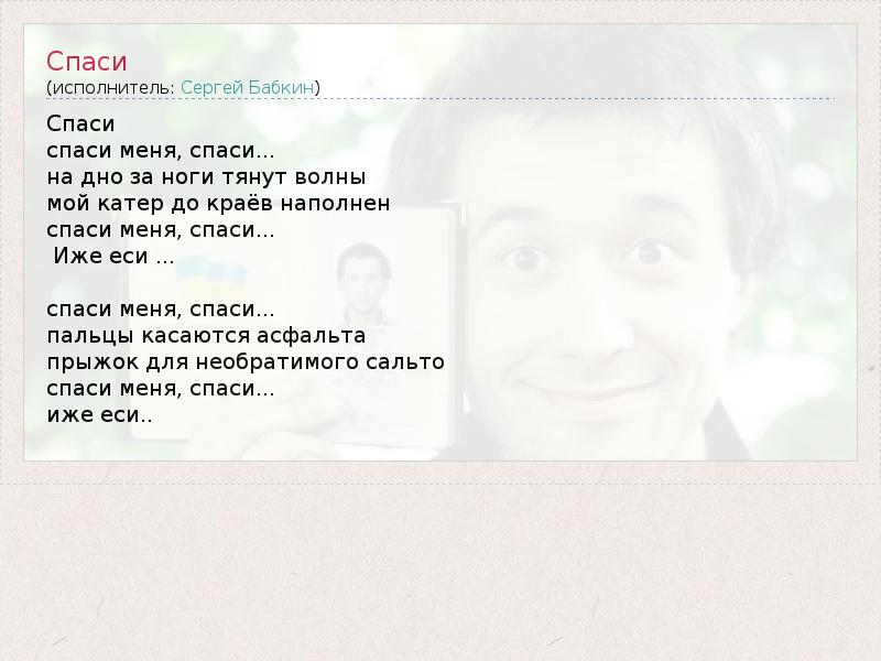 Спаси спаси меня, спаси... на дно за ноги тянут волны мой катер до краёв наполнен спаси меня, спаси... Иже еси ... спаси меня, спаси... пальцы касаются асфальта прыжок для необратимого сальто спаси меня, спаси... иже еси..