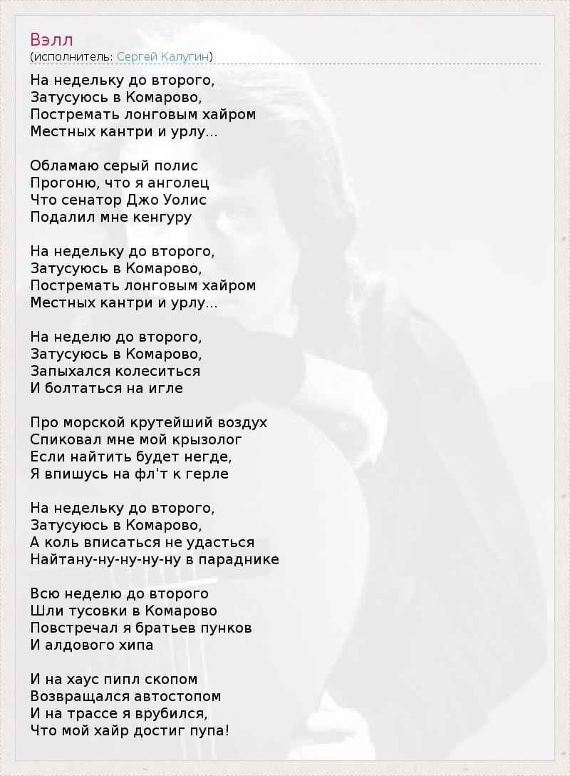 Это интересно:Сергей Калугин — русский поэт, музыкант, автор песен. Музыка Калугина сочетает в себе как классическую гитару, так и традиционные мотивы рок-музыки, при этом используются различные этнические направления, барокко, фламенко.В настоящее время — вокалист, гитарист и автор большинства текстов группы «Оргия Праведников», но также активно выступает сольно.Родился 9 апреля 1967 в городе... продолжение