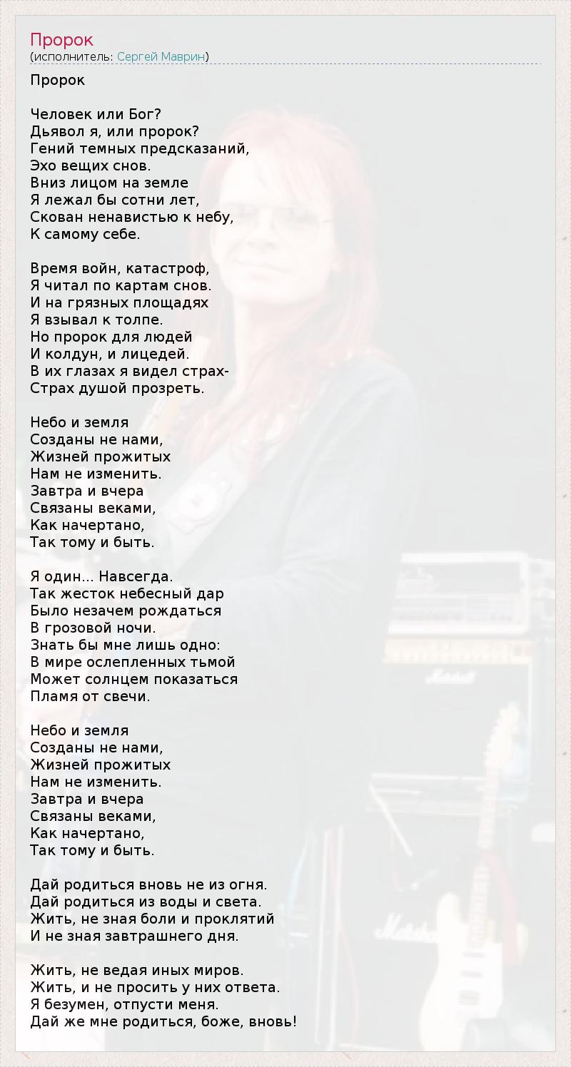 Пророк Человек или Бог? Дьявол я, или пророк? Гений темных предсказаний, Эхо вещих снов. Вниз лицом на земле Я лежал бы сотни лет, Скован ненавистью к небу, К самому себе. Время войн, катастроф, Я читал по картам снов. И на грязных площадях Я взывал к толпе. Но пророк для людей И колдун, и лицедей. В их глазах я видел страх- Страх душой прозреть. Небо и земля Созданы не нами, Жизней прожитых Нам не изменить. Завтра и вчера Связаны веками, Как начертано, Так тому и быть. Я один... Навсегда. Так жесток небесный дар Было незачем рождаться В грозовой ночи. Знать бы мне лишь одно: В мире ослепленных тьмой Может солнцем показаться Пламя от свечи. Небо и земля Созданы не нами, Жизней прожитых Нам не изменить. Завтра и вчера Связаны веками, Как начертано, Так тому и быть. Дай родиться вновь не из огня. Дай родиться из воды и света. Жить, не зная боли и проклятий И не зная завтрашнего дня. Жить, не ведая иных миров. Жить, и не просить у них ответа. Я безумен, отпусти меня. Дай же мне родиться, боже, вновь!