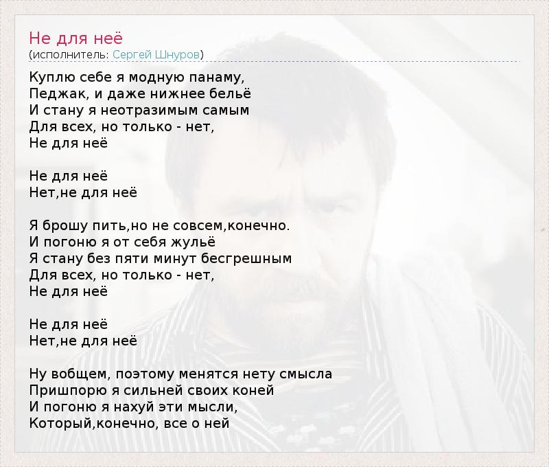 Куплю себе я модную панаму, Педжак, и даже нижнее бельё И стану я неотразимым самым Для всех, но только - нет, Не для неё Не для неё Нет,не для неё Я брошу пить,но не совсем,конечно. И погоню я от себя жульё Я стану без пяти минут бесгрешным Для всех, но только - нет, Не для неё Не для неё Нет,не для неё Ну вобщем, поэтому менятся нету смысла Пришпорю я сильней своих коней И погоню я нахуй эти мысли, Который,конечно, все о ней