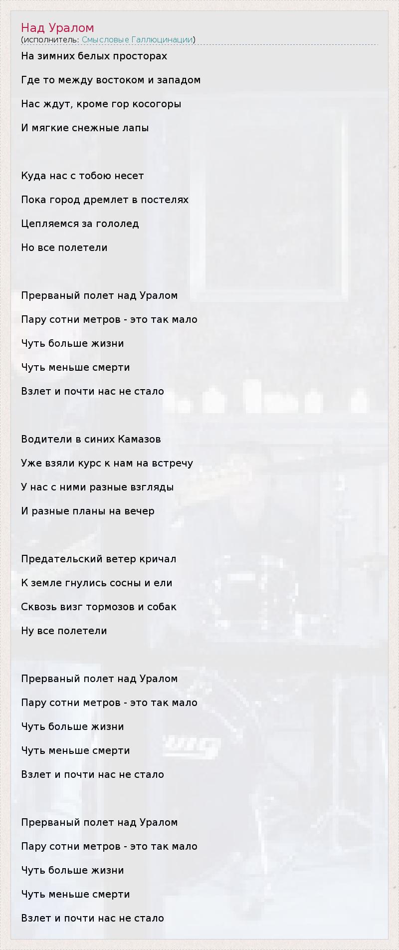 На зимних белых просторах Где то между востоком и западом Нас ждут, кроме гор косогоры И мягкие снежные лапы Куда нас с тобою несет Пока город дремлет в постелях Цепляемся за гололед Но все полетели Прерваный полет над Уралом Пару сотни метров - это так мало Чуть больше жизни Чуть меньше смерти Взлет и почти нас не стало Водители в синих Камазов Уже взяли курс к нам на встречу У нас с ними разные взгляды И разные планы на вечер Предательский ветер кричал К земле гнулись сосны и ели Сквозь визг тормозов и собак Ну все полетели Прерваный полет над Уралом Пару сотни метров - это так мало Чуть больше жизни Чуть меньше смерти Взлет и почти нас не стало Прерваный полет над Уралом Пару сотни метров - это так мало Чуть больше жизни Чуть меньше смерти Взлет и почти нас не стало