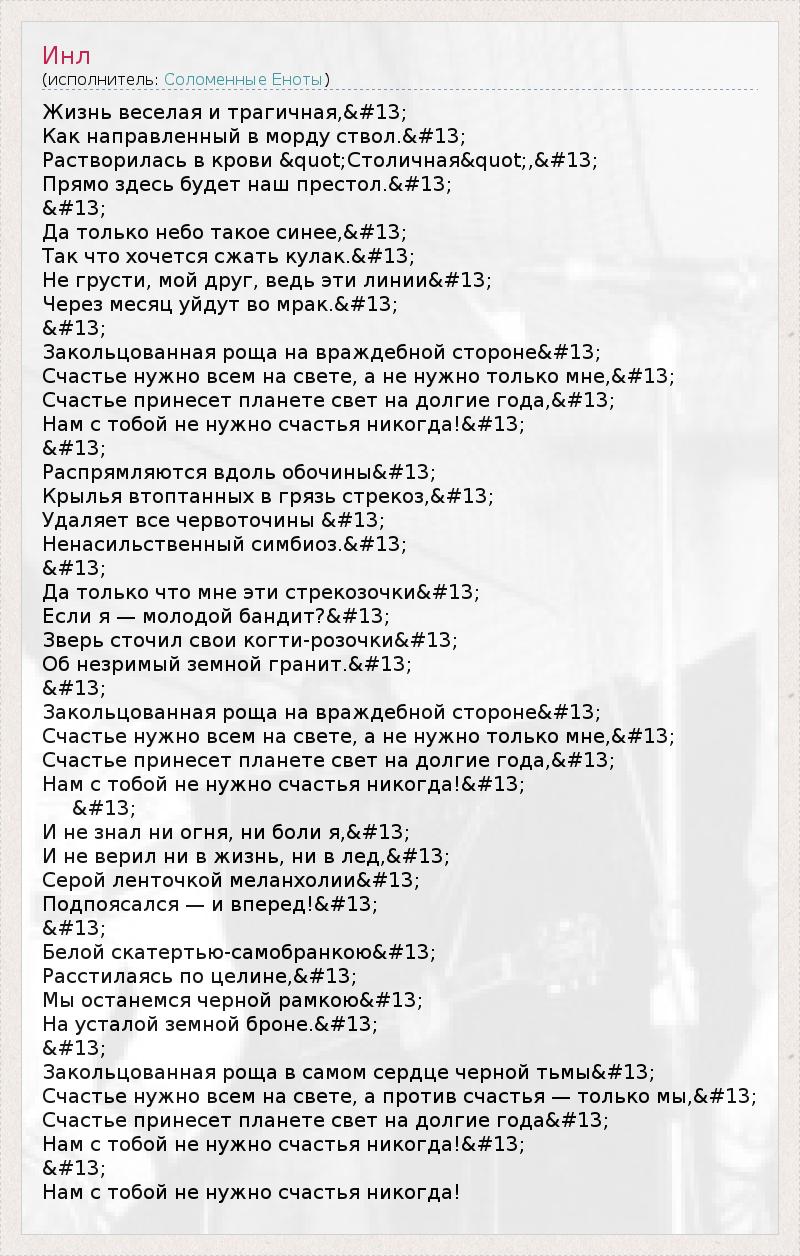 Это интересно:Соломенные Еноты впервые появились на сцене весной 1992 года. "Отцы-основатели" группы Борис Усов и Борис Рудкин на тот момент выпускали самиздатовский журнал "Шумелаъ Мышь", поэтому сразу попали в поле зрения московской рок-журналистики, а вместе и в третью "КонтрКультУр'у". "Наше стеклянное будущее",- было написано там под фотографией Усова… Благодаря ли этому,... продолжение