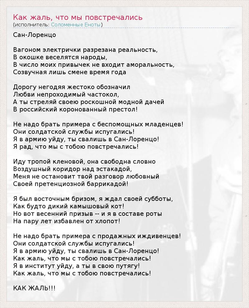 Сан-Лоренцо Вагоном электрички разрезана реальность, В окошке веселятся народы, В число моих привычек не входит аморальность, Созвучная лишь смене время года Дорогу негодяя жестоко обозначил Любви непроходимый частокол, А ты стреляй своею роскошной модной дачей В российский коронованный престол! Не надо брать примера с беспомощных младенцев! Они солдатской службы испугались! Я в армию уйду, ты свалишь в Сан-Лоренцо! Я рад, что мы с тобою повстречались! Иду тропой кленовой, она свободна словно Воздушный коридор над эстакадой, Меня не остановит твой разговор любовный Своей претенциозной баррикадой! Я был восточным бризом, я ждал своей субботы, Как будто дикий камышовый кот! Но вот весенний призыв -- и я в составе роты На пару лет избавлен от хлопот! Не надо брать примера с продажных иждивенцев! Они солдатской службы испугались! Я в армию уйду, ты свалишь в Сан-Лоренцо! Как жаль, что мы с тобою повстречались! Я в институт уйду, а ты в свою путягу! Как жаль, что мы с тобою повстречались! КАК ЖАЛЬ!!!