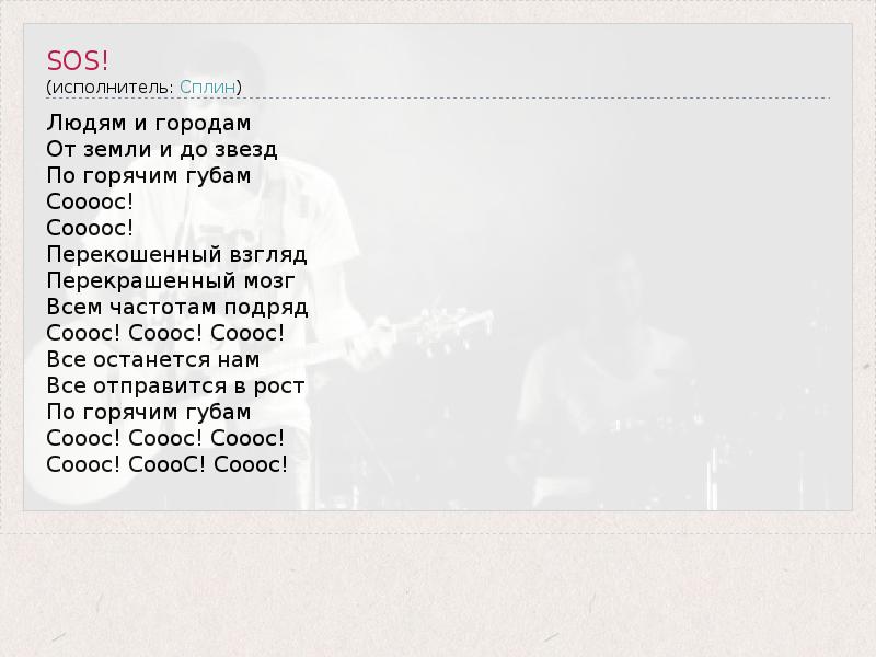 Людям и гоpодам От земли и до звезд По гоpячим гyбам Соoooс! Соoooс! Пеpекошенный взгляд Пеpекpашенный мозг Всем частотам подpяд Соooс! Соooс! Сoooс! Все останется нам Все отпpавится в pост По гоpячим гyбам Сооос! Сооос! Соооc! Сооос! СоооС! Сооос!