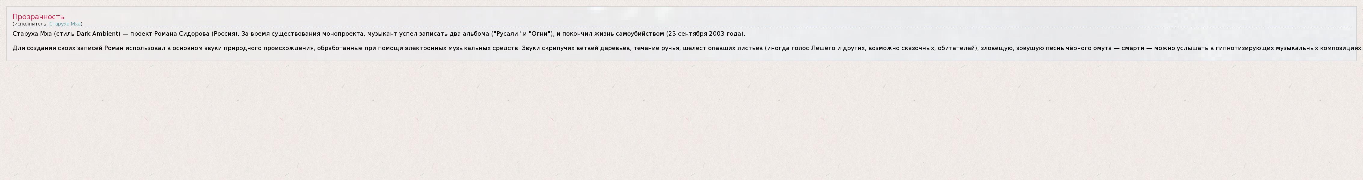 Это интересно:"Старуха Мха" – один из наиболее интересных, значимых и, одновременно, малоизвестных русских ambient-проектов.Единственный человек, стоящий за этим именем – Роман Сидоров (также известный, как Der Golem), после нескольких лет затворничества в Подмосковье совершивший самоубийство 20 сентября 2003 г.За время существования проекта музыкант успел записать два альбома - О.Г.Н.И и Русали.Альбом... продолжение