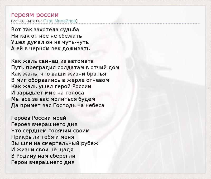 Вот так захотела судьба Ни как от нее не сбежать Ушел думал он на чуть-чуть А ей в черном век доживать Как жаль свинец из автомата Путь преградил солдатам в отчий дом Как жаль, что ваши жизни братья В миг оборвались в жерле огневом Как жаль ушел герой России И зарыдает мир на голоса Мы все за вас молиться будем Да примет вас Господь на небеса Героев России моей Героев вчерашнего дня Что сердцем горячим своим Прикрыли тебя и меня Вы шли на смертельный рубеж И жизни свои не щадя В Родину нам сберегли Герои вчерашнего дня
