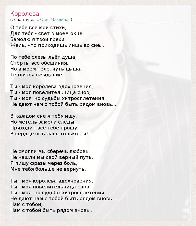 Это интересно:Михайлов Станислав Владимирович (27 апреля 1969, Сочи) — российский эстрадный певец, автор песен, заслуженный артист Российской Федерации (2010). Лауреат премий «Шансон Года» в номинации «Артист года» (Радио Шансон), «Золотой Граммофон» (Русское радио) и фестиваля «Песня года».Родился в семье лётчика и медсестры, его старший брат стал медсестрой. Ещё в юности Стас писал стихи, пел. Следуя... продолжение
