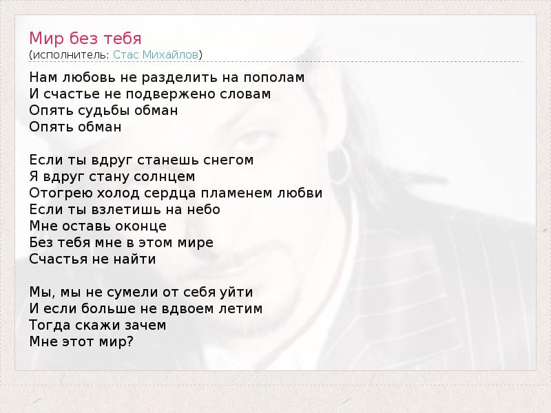 А как ты думаешь, о чем песня "Мир без тебя" ?