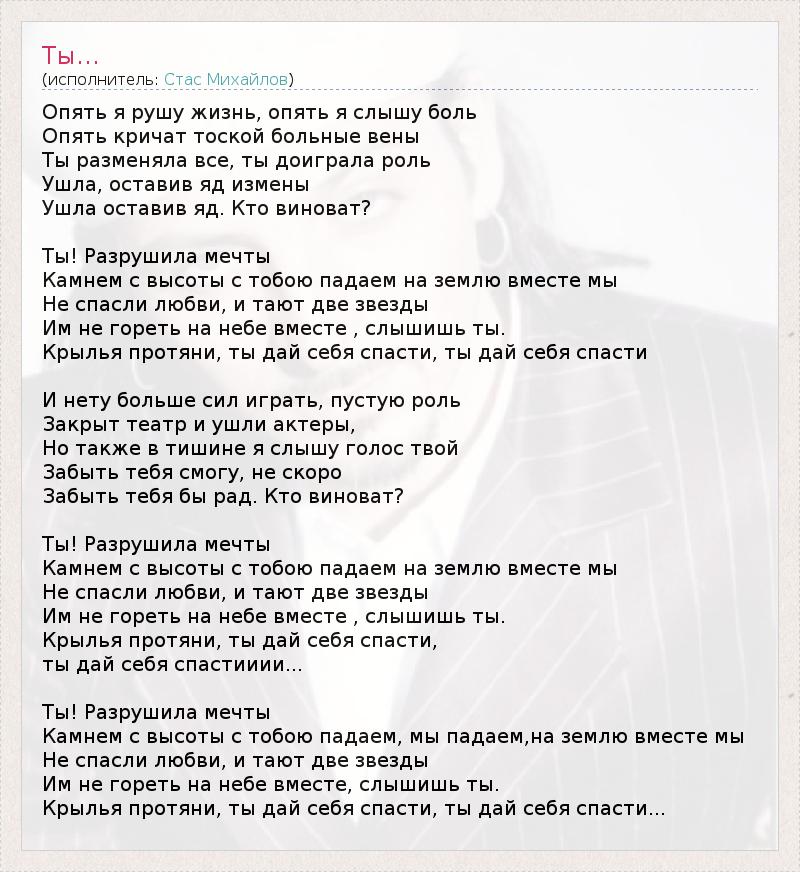 Опять я рушу жизнь, опять я слышу боль Опять кричат тоской больные вены Ты разменяла все, ты доиграла роль Ушла, оставив яд измены Ушла оставив яд. Кто виноват? Ты! Разрушила мечты Камнем с высоты с тобою падаем на землю вместе мы Не спасли любви, и тают две звезды Им не гореть на небе вместе , слышишь ты. Крылья протяни, ты дай себя спасти, ты дай себя спасти И нету больше сил играть, пустую роль Закрыт театр и ушли актеры, Но также в тишине я слышу голос твой Забыть тебя смогу, не скоро Забыть тебя бы рад. Кто виноват? Ты! Разрушила мечты Камнем с высоты с тобою падаем на землю вместе мы Не спасли любви, и тают две звезды Им не гореть на небе вместе , слышишь ты. Крылья протяни, ты дай себя спасти, ты дай себя спастииии... Ты! Разрушила мечты Камнем с высоты с тобою падаем, мы падаем,на землю вместе мы Не спасли любви, и тают две звезды Им не гореть на небе вместе, слышишь ты. Крылья протяни, ты дай себя спасти, ты дай себя спасти...