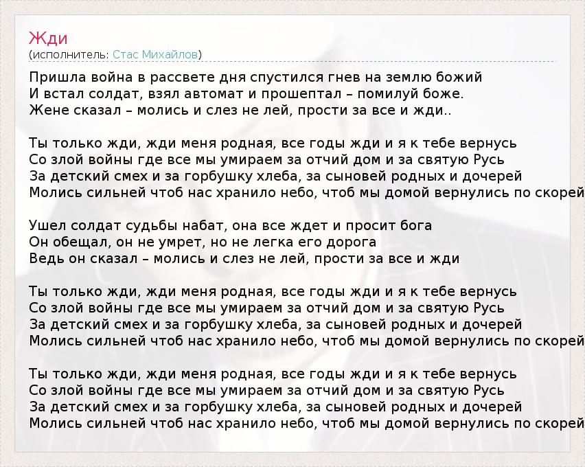 Ты только жди, жди меня родная, все годы жди и я к тебе вернусь