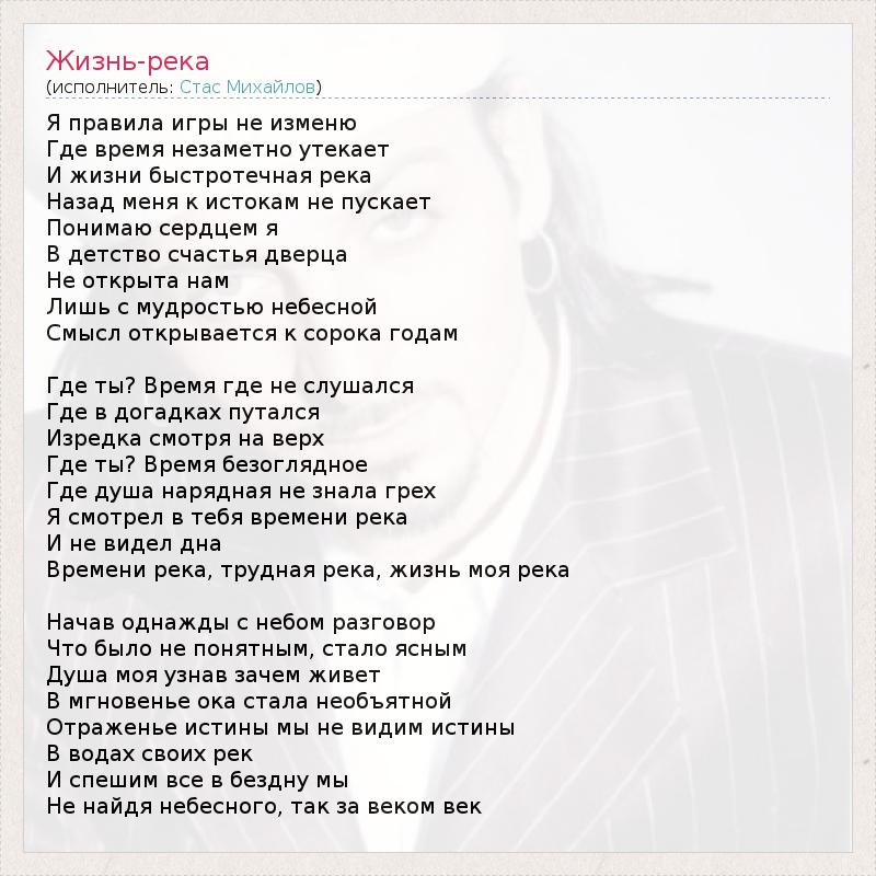 Я правила игры не изменю Где время незаметно утекает И жизни быстротечная река Назад меня к истокам не пускает Понимаю сердцем я В детство счастья дверца Не открыта нам Лишь с мудростью небесной Смысл открывается к сорока годам Где ты? Время где не слушался Где в догадках путался Изредка смотря на верх Где ты? Время безоглядное Где душа нарядная не знала грех Я смотрел в тебя времени река И не видел дна Времени река, трудная река, жизнь моя река Начав однажды с небом разговор Что было не понятным, стало ясным Душа моя узнав зачем живет В мгновенье ока стала необъятной Отраженье истины мы не видим истины В водах своих рек И спешим все в бездну мы Не найдя небесного, так за веком век