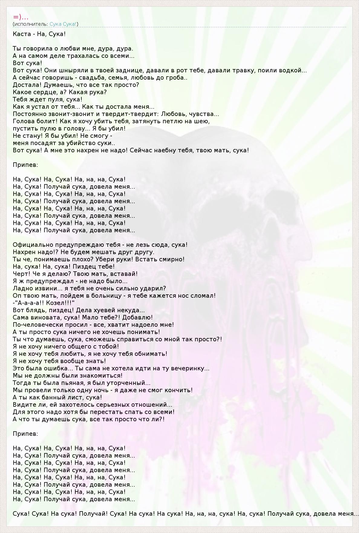 Каста - На, Сука! Ты говорила о любви мне, дура, дура. А на самом деле трахалась со всеми... Вот сука! Вот сука! Они шныряли в твоей заднице, давали в рот тебе, давали травку, поили водкой... А сейчас говоришь - свадьба, семья, любовь до гроба.. Достала! Думаешь, что все так просто? Какое сердце, а? Какая рука? Тебя ждет пуля, сука! Как я устал от тебя... Как ты достала меня... Постоянно звонит-звонит и твердит-твердит: Любовь, чувства... Голова болит! Как я хочу убить тебя, затянуть петлю на шею, пустить пулю в голову... Я бы убил! Не стану! Я бы убил! Не смогу - меня посадят за убийство суки.. Вот сука! А мне это нахрен не надо! Сейчас наебну тебя, твою мать, сука! Припев: На, Сука! На, Сука! На, на, на, Сука! На, Сука! Получай сука, довела меня... На, Сука! На, Сука! На, на, на, Сука! На, Сука! Получай сука, довела меня... На, Сука! На, Сука! На, на, на, Сука! На, Сука! Получай сука, довела меня... На, Сука! На, Сука! На, на, на, Сука! На, Сука! Получай сука, довела меня... Официально предупреждаю тебя - не лезь сюда, сука! Нахрен надо!? Не будем мешать друг другу. Ты че, понимаешь плохо? Убери руки! Встать смирно! На, сука! На, сука! Пиздец тебе! Черт! Че я делаю? Твою мать, вставай! Я ж предупреждал - не надо было... Ладно извини... я тебя не очень сильно ударил? Оп твою мать, пойдем в больницу - я тебе кажется нос сломал! -"А-а-а-а!! Козел!!!" Вот блядь, пиздец! Дела хуевей некуда... Сама виновата, сука! Мало тебе?! Добавлю! По-человечески просил - все, хватит надоело мне! А ты просто сука ничего не хочешь понимать! Ты что думаешь, сука, сможешь справиться со мной так просто?! Я не хочу ничего общего с тобой! Я не хочу тебя любить, я не хочу тебя обнимать! Я не хочу тебя вообще знать! Это была ошибка... Ты сама не хотела идти на ту вечеринку... Мы не должны были знакомиться! Тогда ты была пьяная, я был уторченный... Мы провели только одну ночь - я даже не смог кончить! А ты как банный лист, сука! Видите ли, ей захотелось серьезных отношений... Для этого надо хотя бы перестать спать со всеми! А что ты думаешь сука, все так просто что ли?! Припев: На, Сука! На, Сука! На, на, на, Сука! На, Сука! Получай сука, довела меня... На, Сука! На, Сука! На, на, на, Сука! На, Сука! Получай сука, довела меня... На, Сука! На, Сука! На, на, на, Сука! На, Сука! Получай сука, довела меня... На, Сука! На, Сука! На, на, на, Сука! На, Сука! Получай сука, довела меня... Сука! Сука! На сука! Получай! Сука! На сука! На сука! На, на, на, сука! На, сука! Получай сука, довела меня...