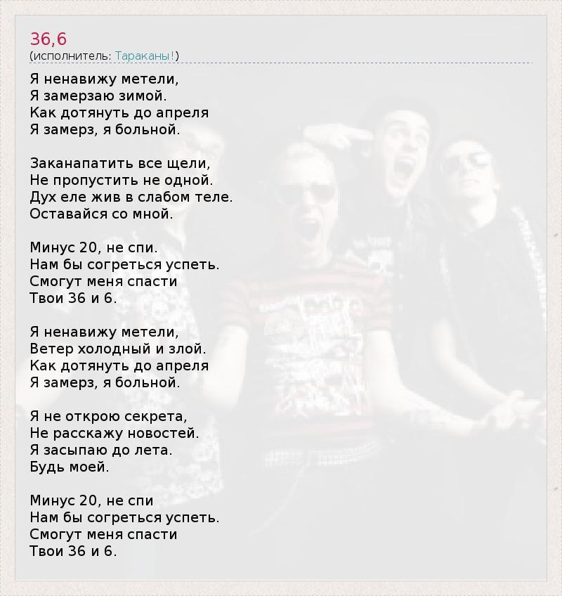 Я ненавижу метели, Я замерзаю зимой. Как дотянуть до апреля Я замерз, я больной. Заканапатить все щели, Не пропустить не одной. Дух еле жив в слабом теле. Оставайся со мной. Минус 20, не спи. Нам бы согреться успеть. Смогут меня спасти Твои 36 и 6. Я ненавижу метели, Ветер холодный и злой. Как дотянуть до апреля Я замерз, я больной. Я не открою секрета, Не расскажу новостей. Я засыпаю до лета. Будь моей. Минус 20, не спи Нам бы согреться успеть. Смогут меня спасти Твои 36 и 6.