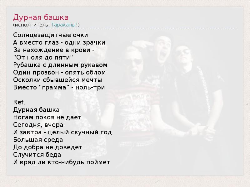 Солнцезащитные очки А вместо глаз - одни зрачки За нахождение в крови - "От ноля до пяти" Рубашка с длинным рукавом Один прозвон - опять облом Осколки сбывшейся мечты Вместо "грамма" - ноль-три Ref. Дурная башка Ногам покоя не дает Сегодня, вчера И завтра - целый скучный год Большая среда До добра не доведет Случится беда И вряд ли кто-нибудь поймет