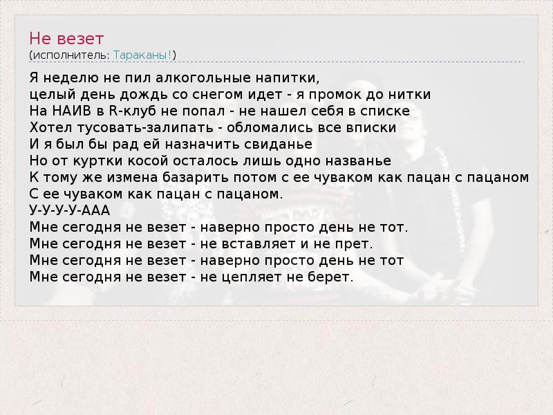 Я неделю не пил алкогольные напитки, целый день дождь со снегом идет - я промок до нитки На НАИВ в R-клуб не попал - не нашел себя в списке Хотел тусовать-залипать - обломались все вписки И я был бы рад ей назначить свиданье Но от куртки косой осталось лишь одно названье К тому же измена базарить потом с ее чуваком как пацан с пацаном С ее чуваком как пацан с пацаном. У-У-У-У-ААА Мне сегодня не везет - наверно просто день не тот. Мне сегодня не везет - не вставляет и не прет. Мне сегодня не везет - наверно просто день не тот Мне сегодня не везет - не цепляет не берет.