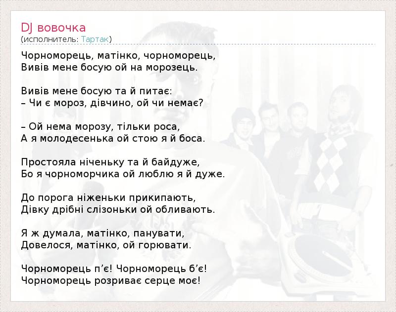 Это интересно:Точкой отсчёта истории группы Тартак является 1996-ой год. Именно тогда новосозданный проект принимает участие в отборочном туре фестиваля "Червона Рута", на котором, собственно, и побеждает. После презентации на фестивале песен "О-ля-ля", "Подаруй Мені Кохання" и "Божевільні Танці" Тартак становится лауреатом первой премии в жанре танцевальной музыки. В конце 1997-го... продолжение