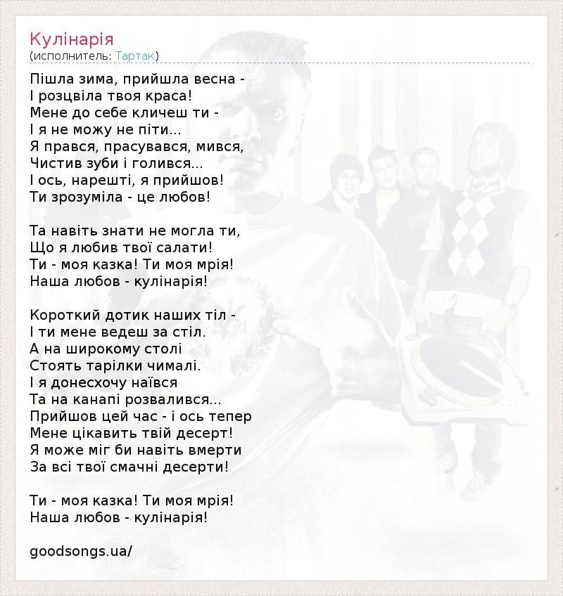 Пішла зима, прийшла весна - І розцвіла твоя краса! Мене до себе кличеш ти - І я не можу не піти... Я прався, прасувався, мився, Чистив зуби і голився... І ось, нарешті, я прийшов! Ти зрозуміла - це любов! Та навіть знати не могла ти, Що я любив твої салати! Ти - моя казка! Ти моя мрія! Наша любов - кулінарія! Короткий дотик наших тіл - І ти мене ведеш за стіл. А на широкому столі Стоять тарілки чималі. І я донесхочу наївся Та на канапі розвалився... Прийшов цей час - і ось тепер Мене цікавить твій десерт! Я може міг би навіть вмерти За всі твої смачні десерти! Ти - моя казка! Ти моя мрія! Наша любов - кулінарія! goodsongs.ua/