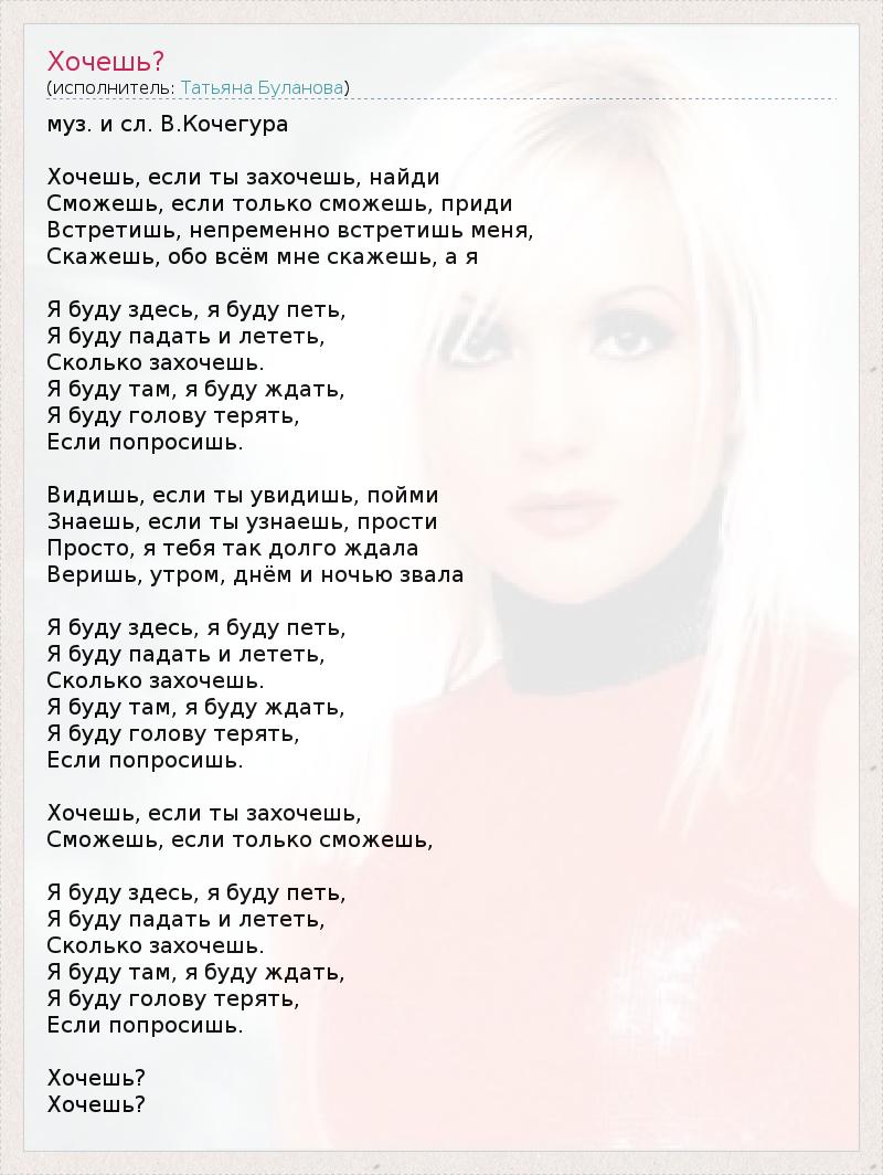 муз. и сл. В.Кочегура Хочешь, если ты захочешь, найди Сможешь, если только сможешь, приди Встретишь, непременно встретишь меня, Скажешь, обо всём мне скажешь, а я Я буду здесь, я буду петь, Я буду падать и лететь, Сколько захочешь. Я буду там, я буду ждать, Я буду голову терять, Если попросишь. Видишь, если ты увидишь, пойми Знаешь, если ты узнаешь, прости Просто, я тебя так долго ждала Веришь, утром, днём и ночью звала Я буду здесь, я буду петь, Я буду падать и лететь, Сколько захочешь. Я буду там, я буду ждать, Я буду голову терять, Если попросишь. Хочешь, если ты захочешь, Сможешь, если только сможешь, Я буду здесь, я буду петь, Я буду падать и лететь, Сколько захочешь. Я буду там, я буду ждать, Я буду голову терять, Если попросишь. Хочешь? Хочешь?