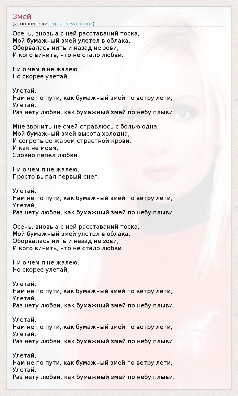 Это интересно:Татьяна Буланова родилась 6 марта, 1969 г. в Ленинграде.Во время учёбы в институте Татьяна параллельно работала в библиотеке Военно-морской академии на иностранном факультете. Узнав, что в школу-студию при петербургском мюзик-холле набираются учащиеся, Татьяна с третьего курса института культуры осенью 1989 года ушла, на вокальное отделение, где проучилась около года. В 1989 году данное... продолжение