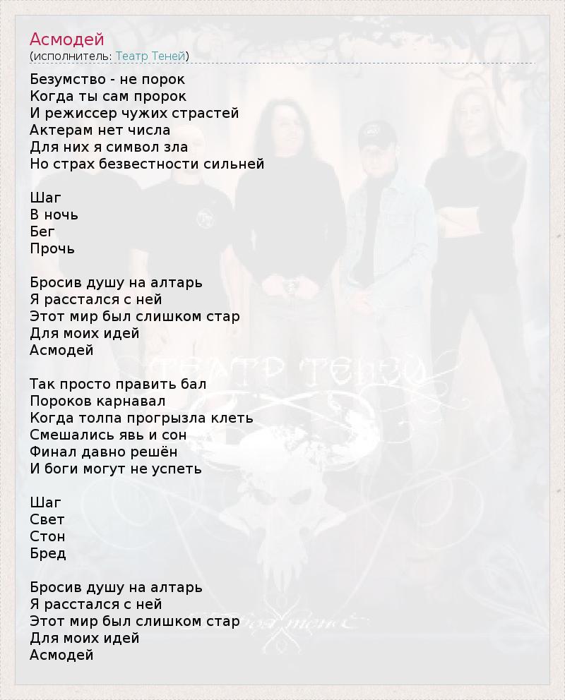 Это интересно:Группа была основана Денисом Машаровым в 1986-ом году.Для начала Театральный репертуар состоял из классики - из тех вещей, которые принадлежат Вечности, которые всегда проникают в самое сердце…Шли годы. Театр Теней подбирал новых актеров. Кто-то уходил из труппы, навсегда унося в своем сердце частичку великолепного спектакля теней…Писались и ставились новые пьесы, пробовались... продолжение
