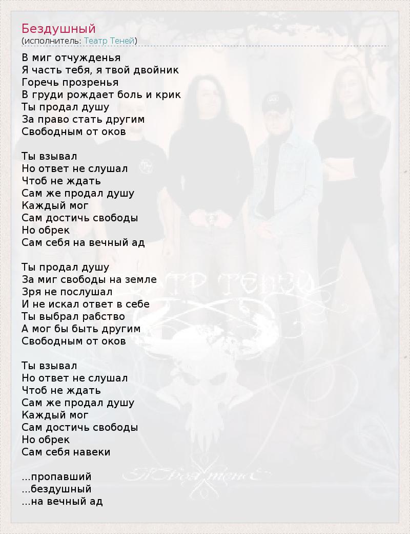 В миг отчужденья Я часть тебя, я твой двойник Горечь прозренья В груди рождает боль и крик Ты продал душу За право стать другим Свободным от оков Ты взывал Но ответ не слушал Чтоб не ждать Сам же продал душу Каждый мог Сам достичь свободы Но обрек Сам себя на вечный ад Ты продал душу За миг свободы на земле Зря не послушал И не искал ответ в себе Ты выбрал рабство А мог бы быть другим Свободным от оков Ты взывал Но ответ не слушал Чтоб не ждать Сам же продал душу Каждый мог Сам достичь свободы Но обрек Сам себя навеки ...пропавший ...бездушный ...на вечный ад
